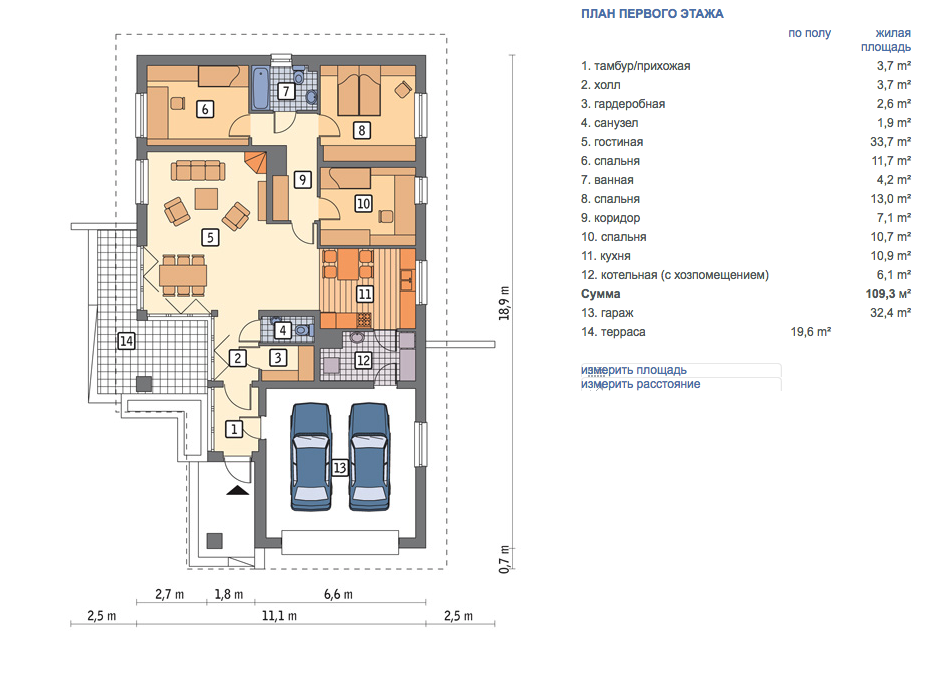Габариты дома: 11.10 x 18.90 м