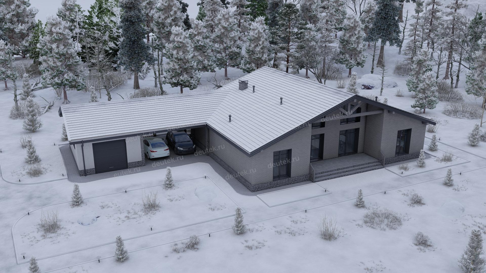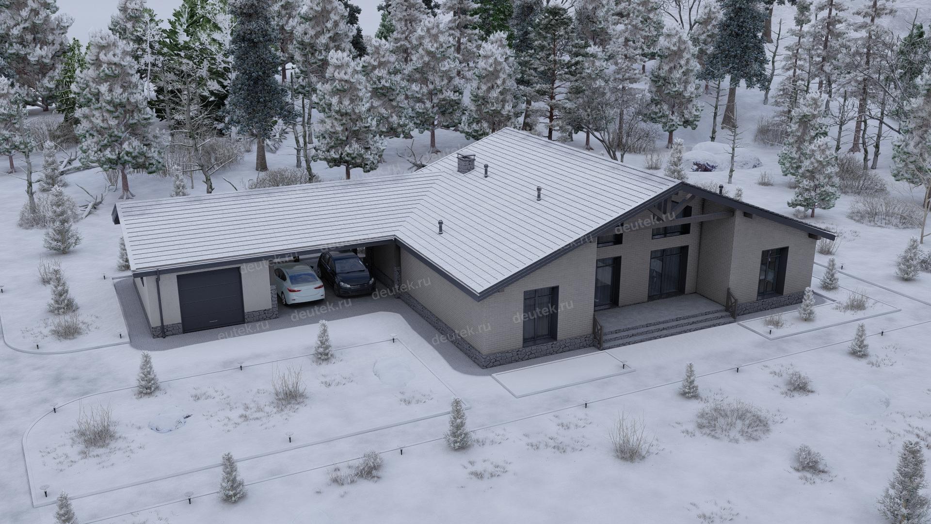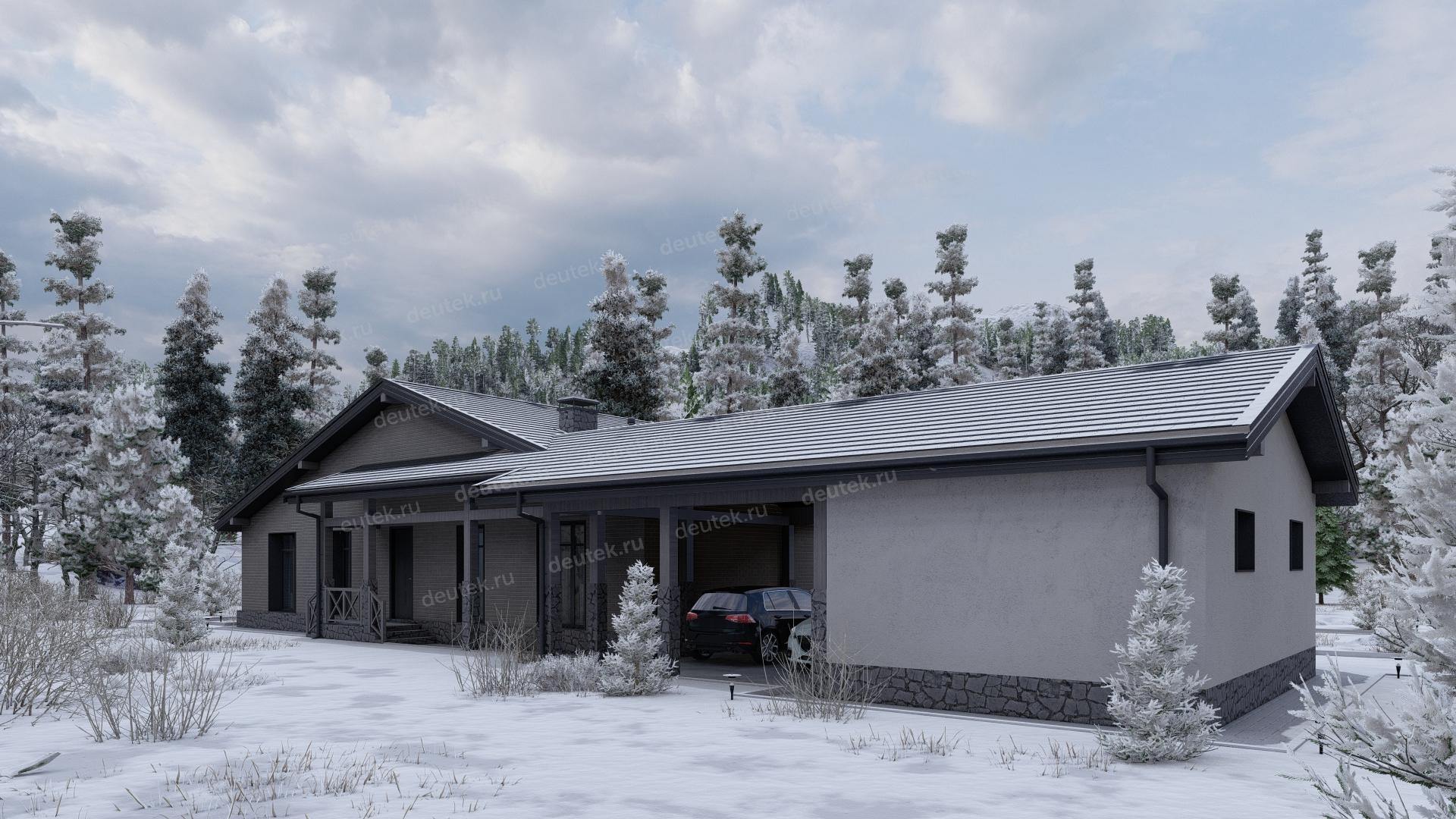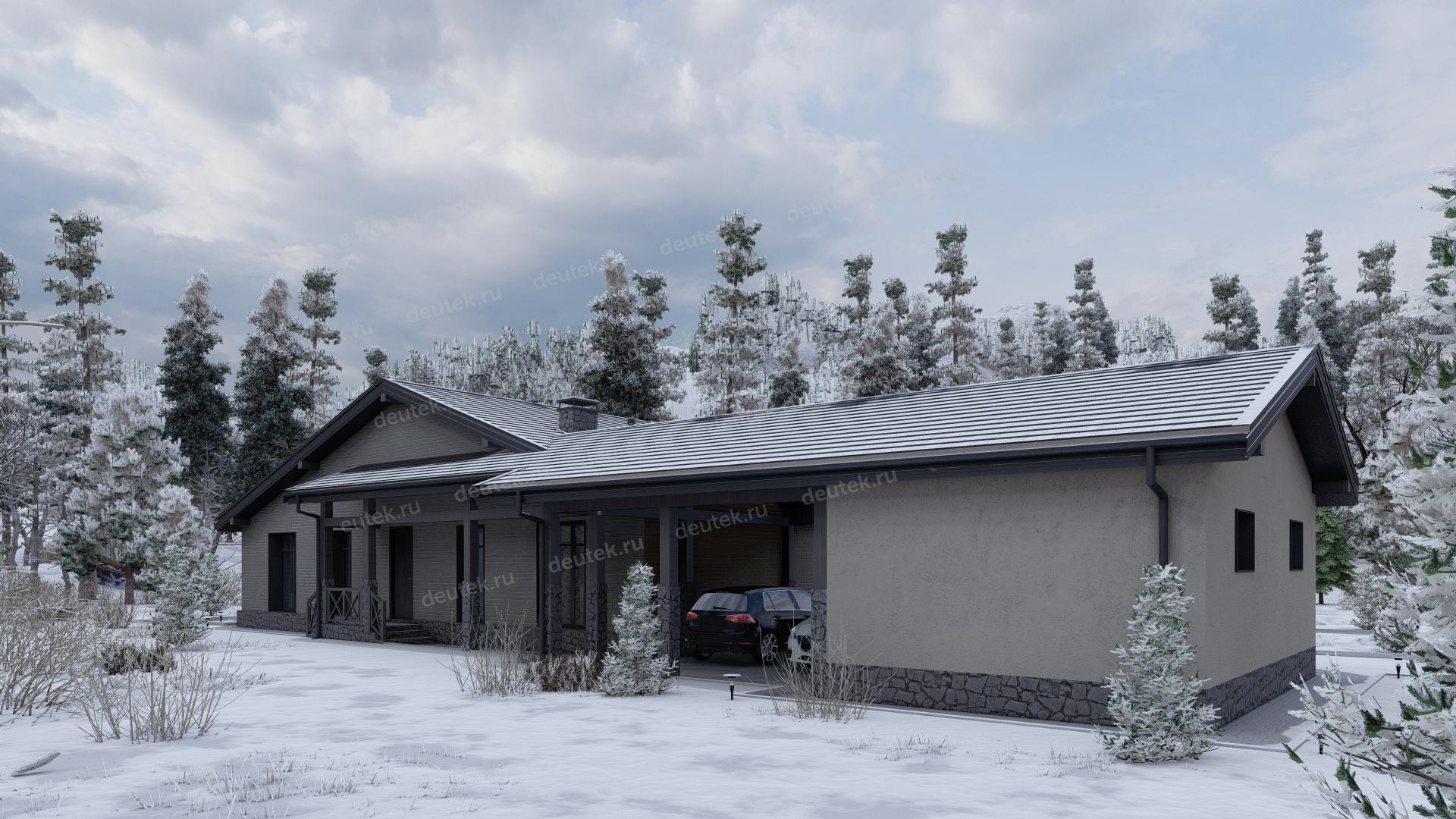 Проект одноэтажного дома с навесом для двух автомобилей и одноместным гаражом - P245