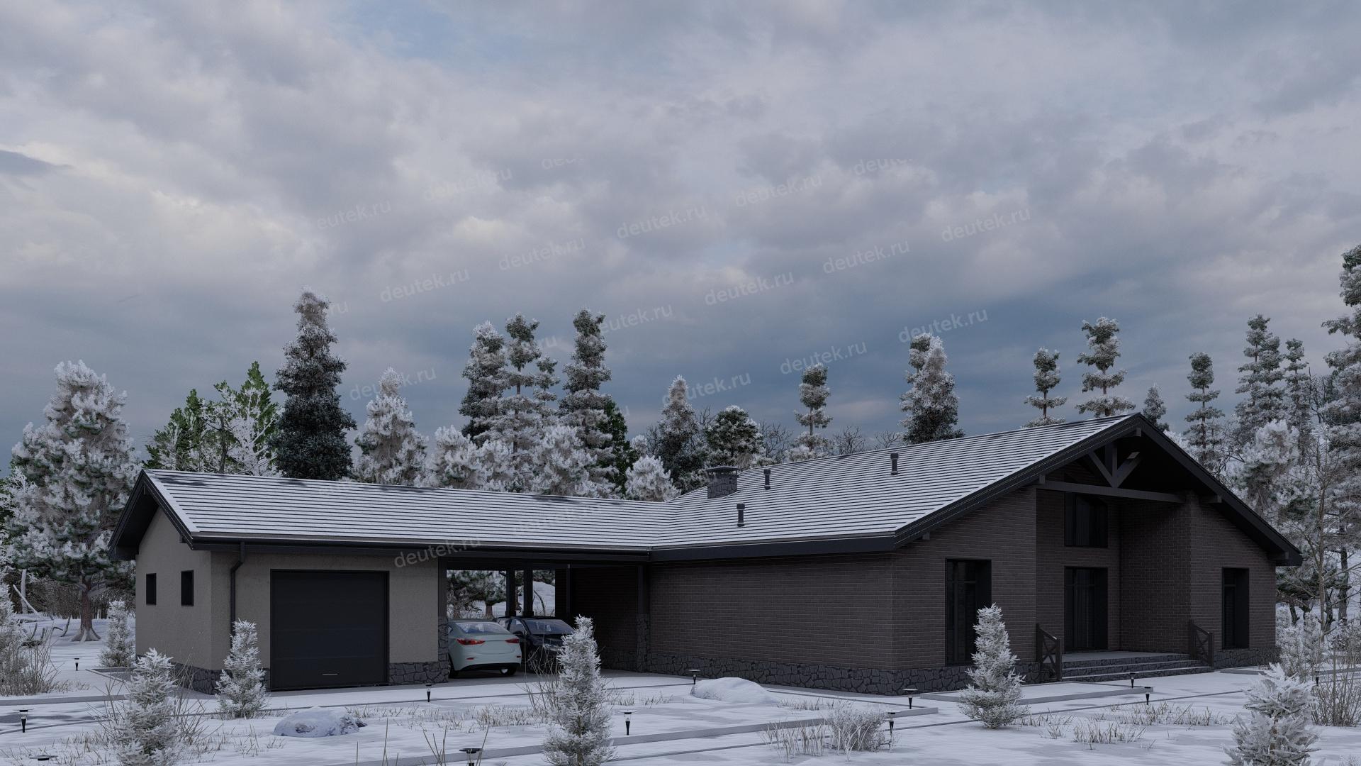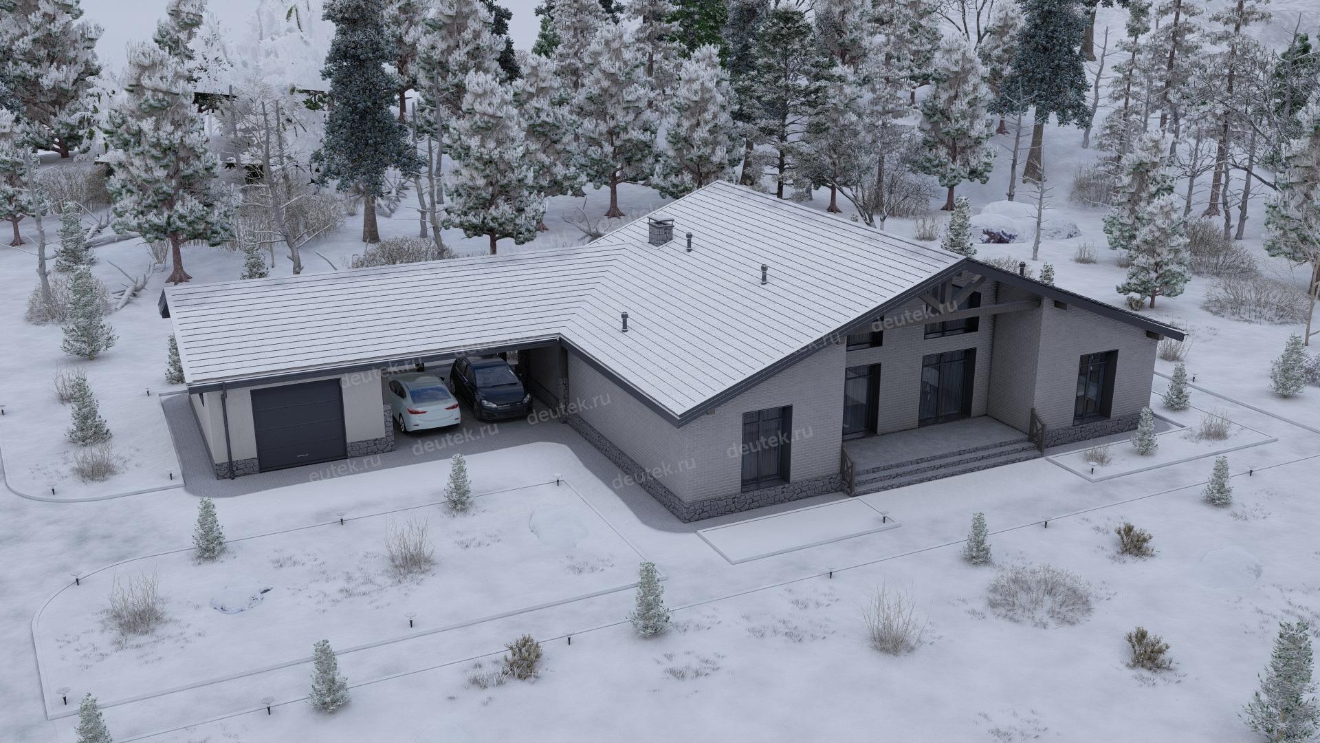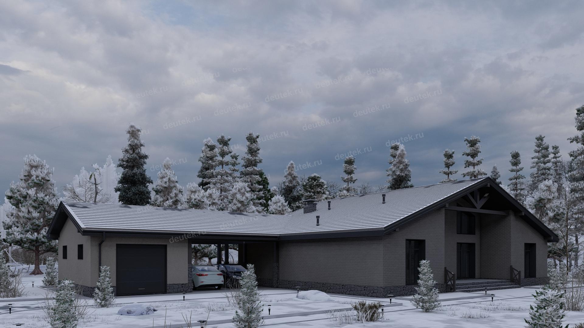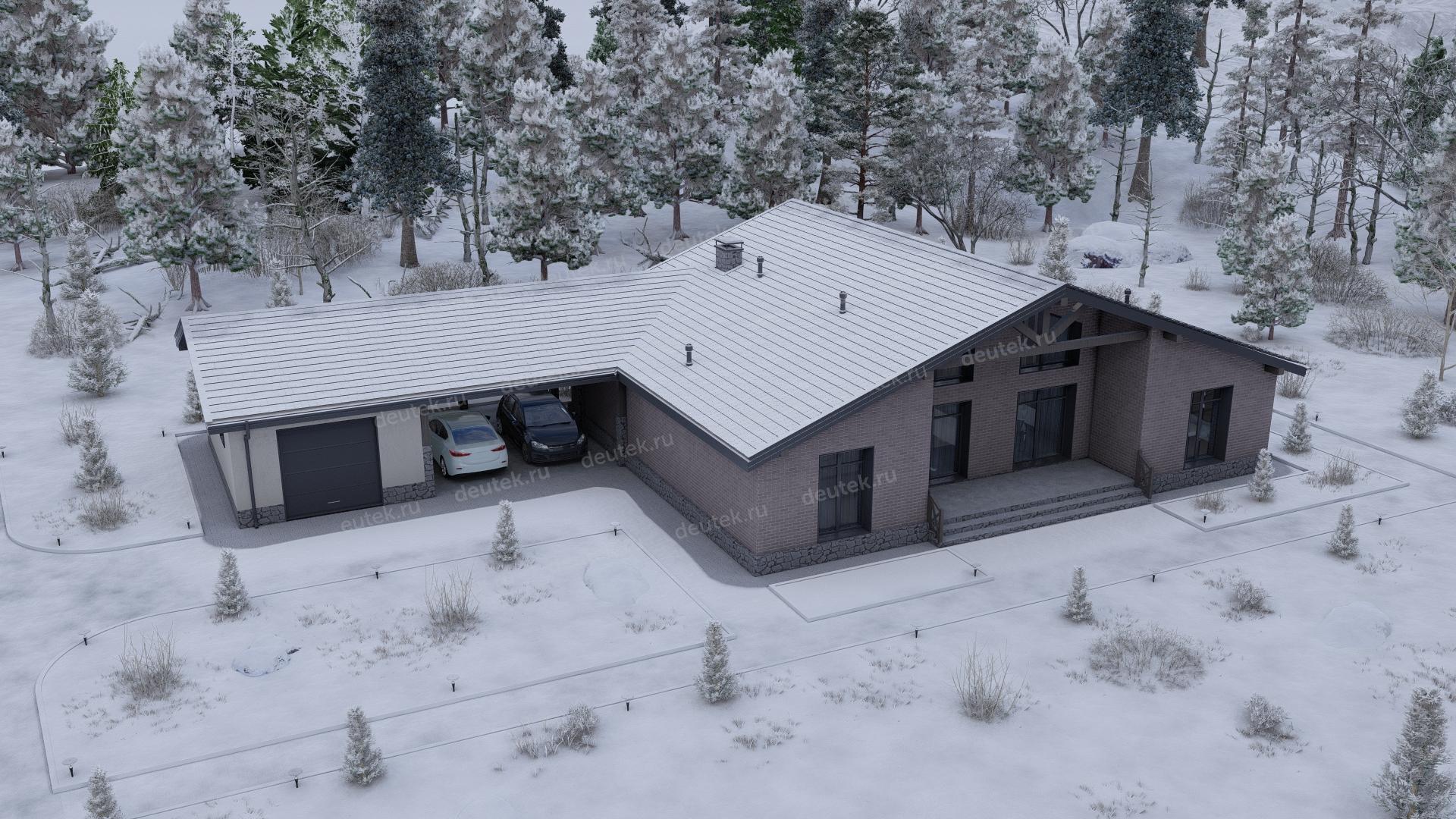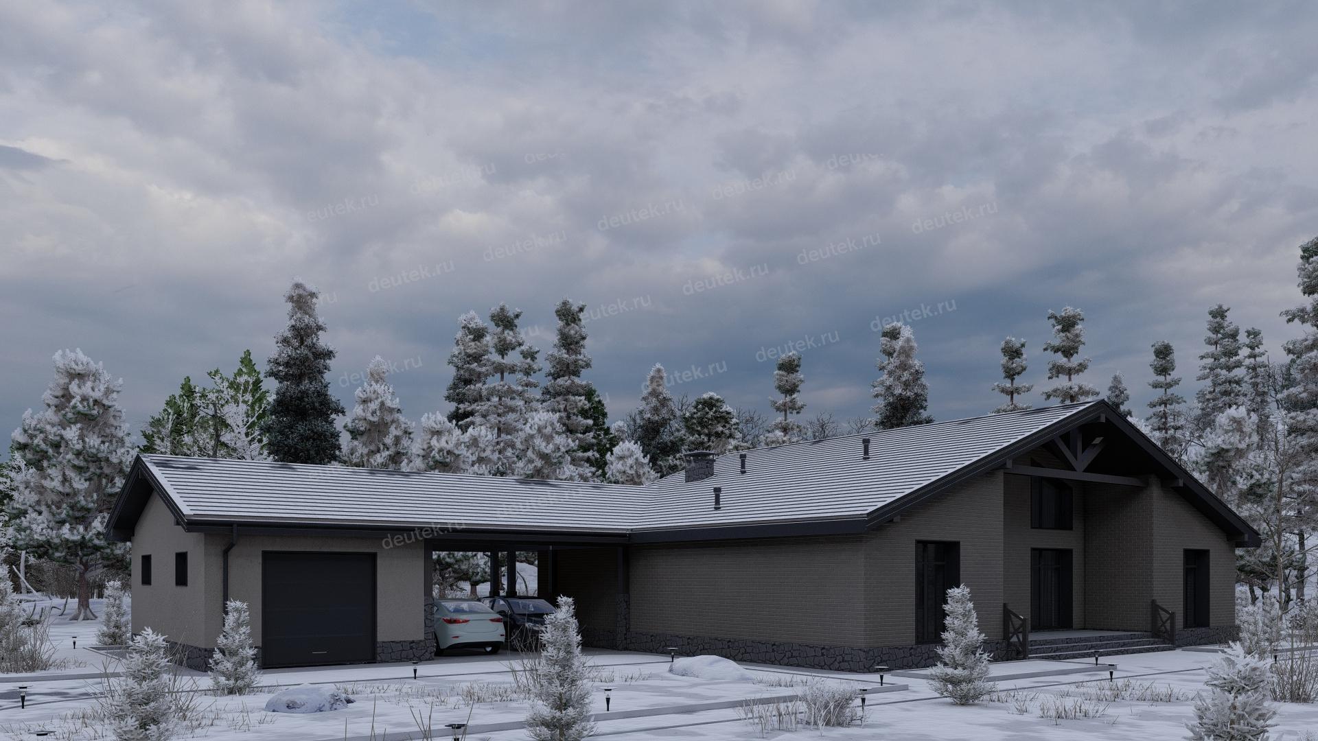 Проект одноэтажного дома с навесом для двух автомобилей и одноместным гаражом - P245