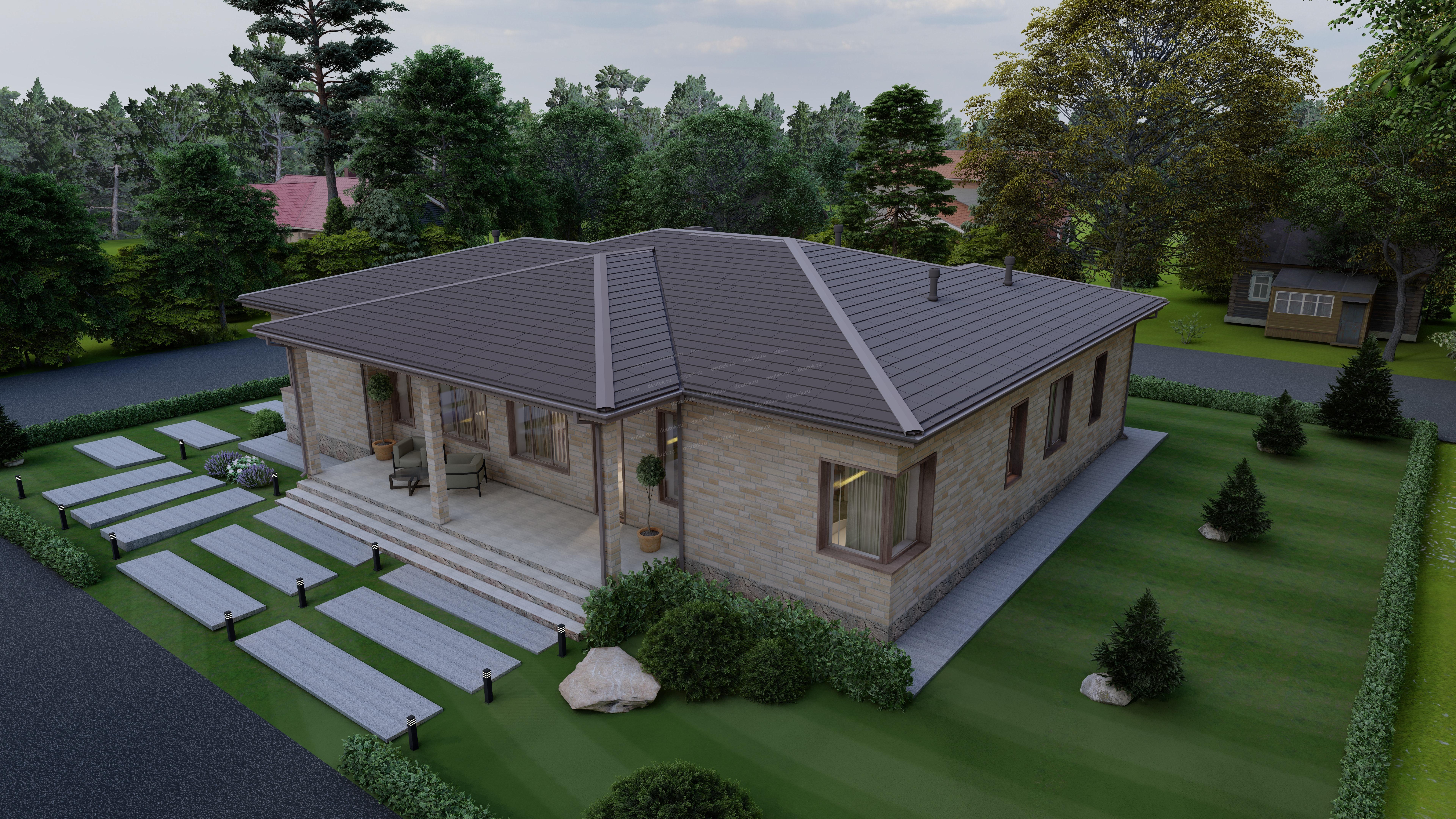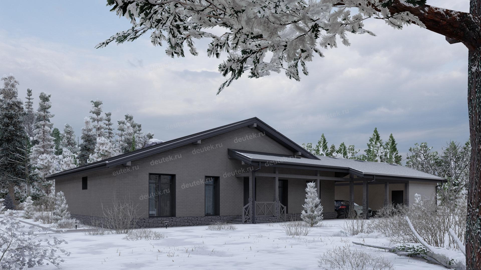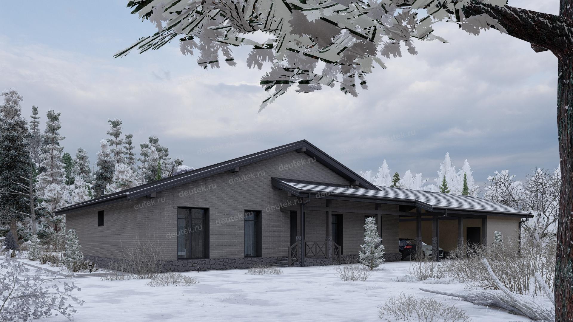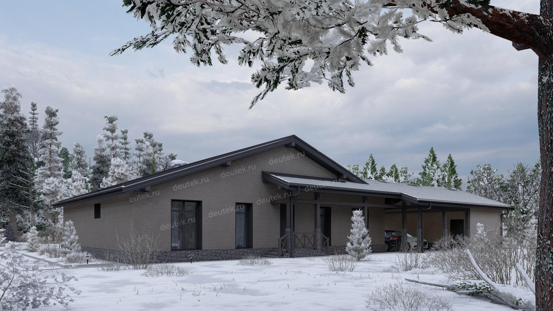 Проект одноэтажного дома с навесом для двух автомобилей и одноместным гаражом - P245